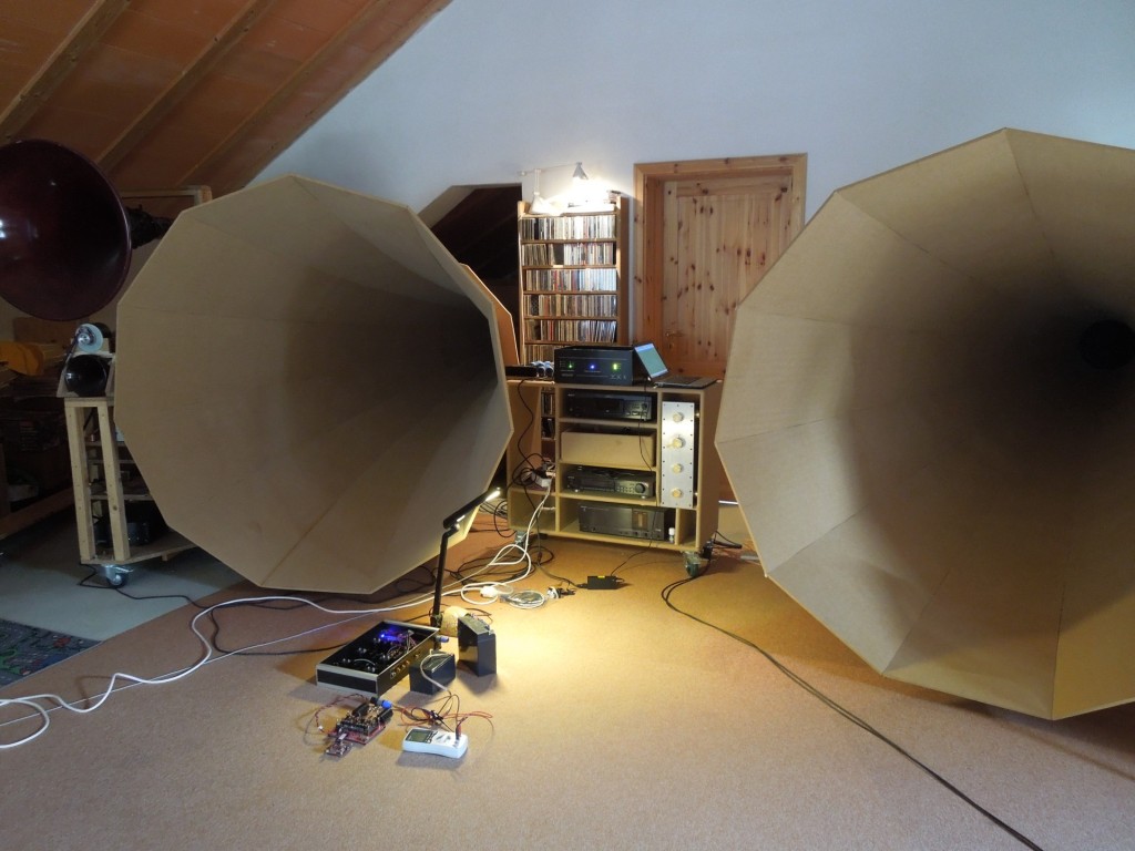 Between the GOTO bass horns, the good old DDDAC1543, DDDAC1794 and power supplies and batteries. Of course a notebook with Foobar and WASAPI